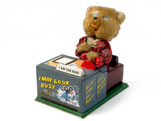 hauteur 19 cm - moteur à piles (à revoir) - en action, l'ours écrit sur son bloc-notes & décroche le téléphone lorsque celui-ci sonne - il remue la tête tout en discutant - importantes traces de corrosion sur le socle - 19 cm tall - battery operated (subject to verification) - in action, the bear writes on his notepad & answers the telephone when it rings - he shakes his head when speaking - significant rust on the base
