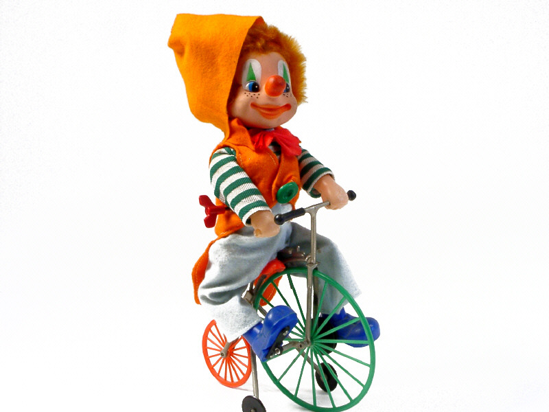 hauteur 39 cm - moteur à ressort (fonctionne) - en action, le clown avance en pédalant tandis que son bonnet bouge - manque une fixation de selle & courroie d'entraînement de la roue permettant à l'engin d'avancer - 39 cm tall - clockwork mechanism (in working condition) - in action, the clown pedals forward as his hat moves - one seat fixture & the belt that lets the bike move forward missing