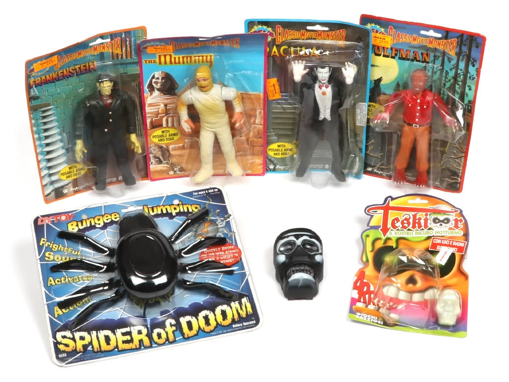 comprend : 4 figurines CLASSIC MOVIE MONSTER (FRANKENSTEIN, THE MUMMY, DRACULA & WOLFMAN), une araignée mécanique & une boucle de ceinture en forme de crâne (blister découpé) - cartes en état 'b' avec accrocs, frottements & petits manques de papier - on y retrouve les marques DYTOY, GIOCHI PREZIOSI & IMPERIAL TOY