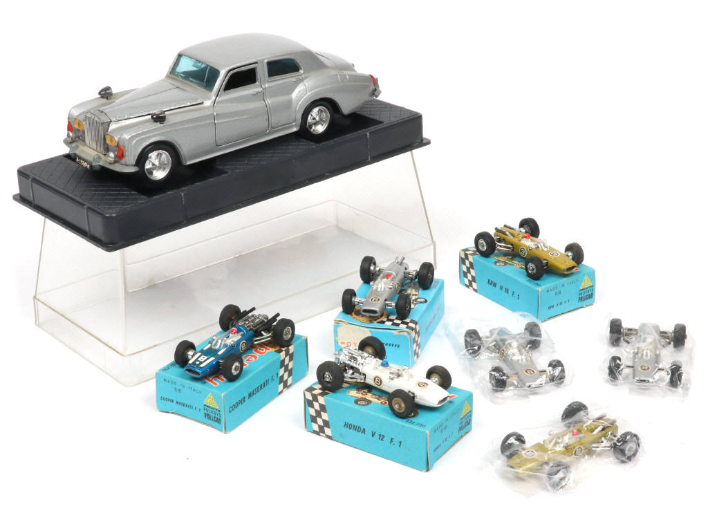 échelle : 1/25ème - pare-chocs ternis - pellicule chromée des rétroviseurs altérée - sigle de calandre cassé & manquant - quelques petits défauts de peinture d'origine par endroits - on y joint 7 F1 de la marque POLITOYS (série PENNY) en états 'A' & 'B' (un exemplaire avec un rétroviseur manquant, pellicule chromée des jantes plus ou moins altérée, 4 exemplaires avec boîte état 'b')