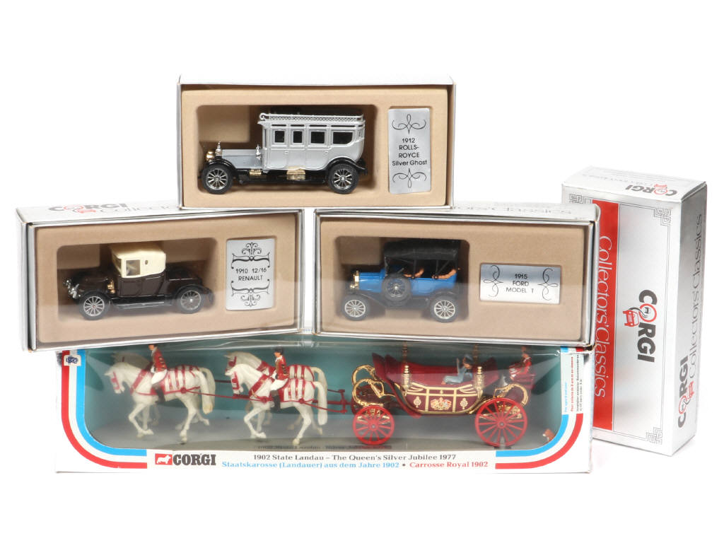 comprend : RENAULT 12/16 1910, FORD MODEL T 1915, ROLLS ROYCE SILVER CLOUD 1912 & Carrosse Royal 1902 'JUBILEE 1977'