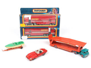 comprend : camion semi-remorque DAF 'FERRARI', GUY WARRIOR transporteur de voitures (manque un pneu) & HEALEY SPORTS BOAT avec remorque (éclats sur cette dernière) - on y retrouve les marques MATCHBOX & DINKY TOYS - on y joint une JAGUAR type E de la marque TEKNO (DANEMARK) en état 'D' avec petits manques, parties cassées & non d'origine