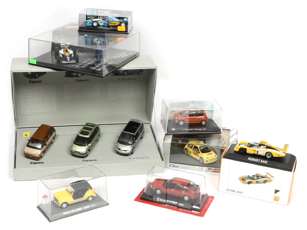 comprend notamment les marques : NOREV, ONYX, AUTOPLUS, OLIEX & UNIVERSAL HOBBIES - on y retrouve notamment les modèles : coffret RENAULT ESPACE (20 ans), coffret CLIO TROPHY RENAULT SPORT, coffret 'AU REVOIR ALAIN' & RENAULT 21 GTS - boîtes en états 'b' à 'c'