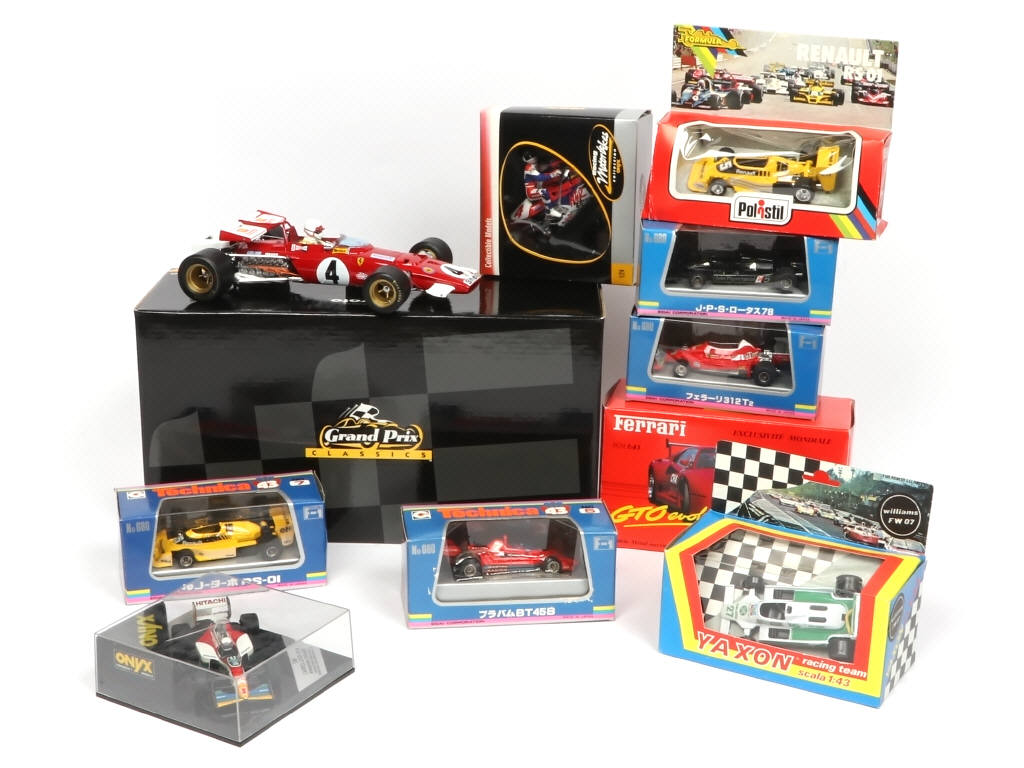 différentes échelles (1/43ème & 1/18ème) - comprend notamment les marques : EXOTO (FERRARI 312 B - 1/18ème), POLISTIL, TECHNICA, JOUEF EVOLUTION, ONYX & YAXON - on y retrouve notamment les modèles : CASTROL LOTUS 107 B, RENAULT RS 01 & FERRARI GTO EVOLUZIONE - boîtes en état 'a' à 'c'