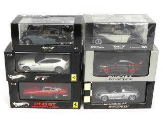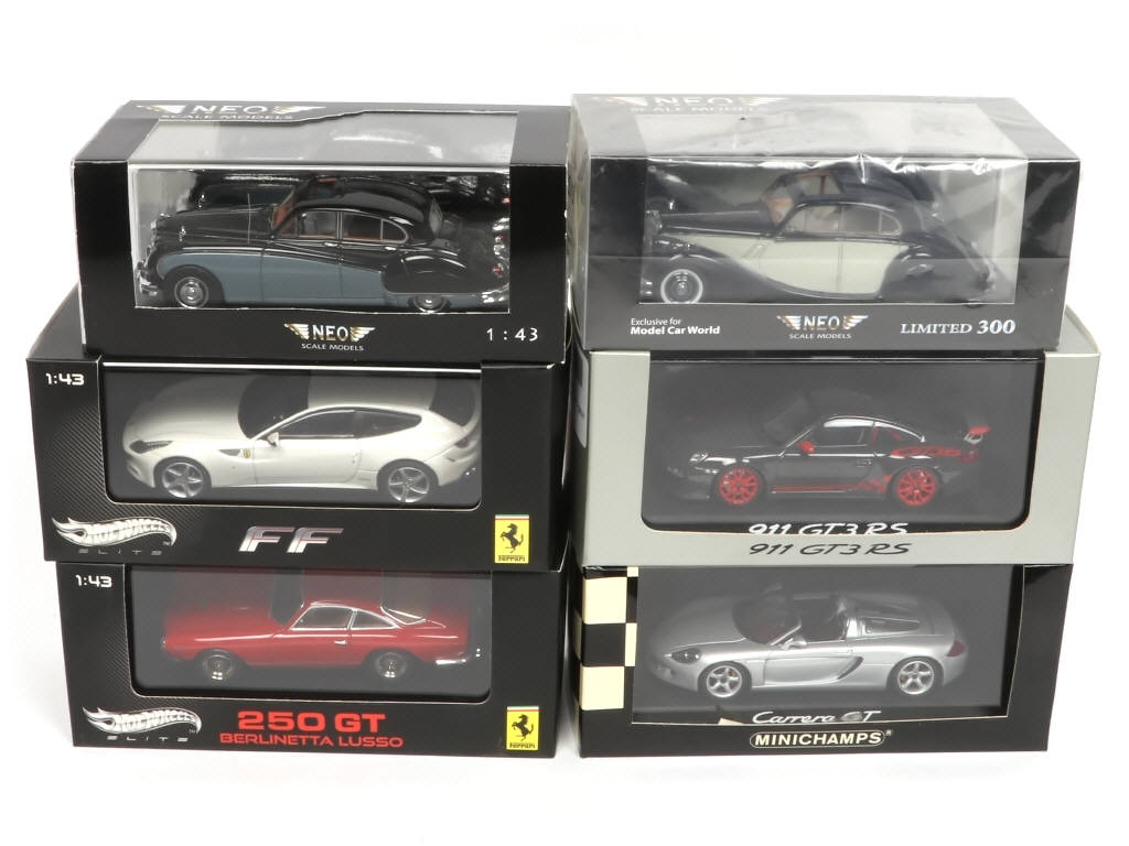 comprend les marques : MINICHAMPS, NEO & HOTWHEELS - on y retrouve notamment les modèles : JAGUAR MK V, PORSCHE CARRERA GT, FERRARI 250 GT BERLINETTA LUSSO & PORSCHE 911 GT3 RS - boîtes en états 'a' à 'b'