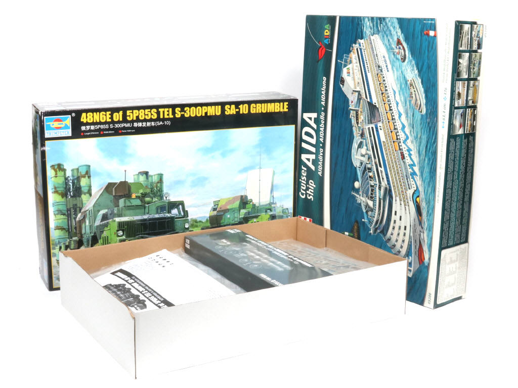 réalisation en plastique - à monter avec nombreuses grappes d'accessoires jamais détachés & notices (semblent complets, possibilité de petits éléments cassés) - échelles 1/35ème & 1/400ème - comprend : SA-10 GRUMBLE lanceur d'engins & AIDA bateau de croisières - on y retrouve les marques : TRUMPETER & REVELL
