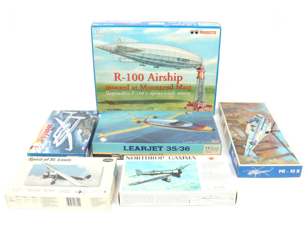 semblent complets - échelles : 1/500ème, 1/72ème & 1/48ème - comprend notamment : LEARJET, VOYAGER, NORTHROP, R-100 AIRSHIP & SPIRIT OF ST LOUIS - on y retrouve notamment les marques : AMODEL, HASEGAWA, WILLIAMS, TESTOR