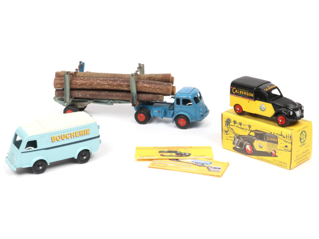 avec manques, parties cassées, décolorées & oxydées - on y joint une citroen 2cv fourgonnette 'CALBERSON' (avec certificat d'édition limitée numéroté & mini-catalogue - boite en état 'a') & un RENAULT 1000 kg 'BOUCHERIE' (sans boite) de la marque C.I.J/NOREV (états 'A+')