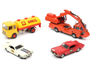 comprend : MERCEDES LP 1418/46 camion-grue (un caoutchouc de maintien de verin légèrement fendu), SAVIEM citerne 'SHELL (jantes légèrement fondues) & FORD MUSTANG