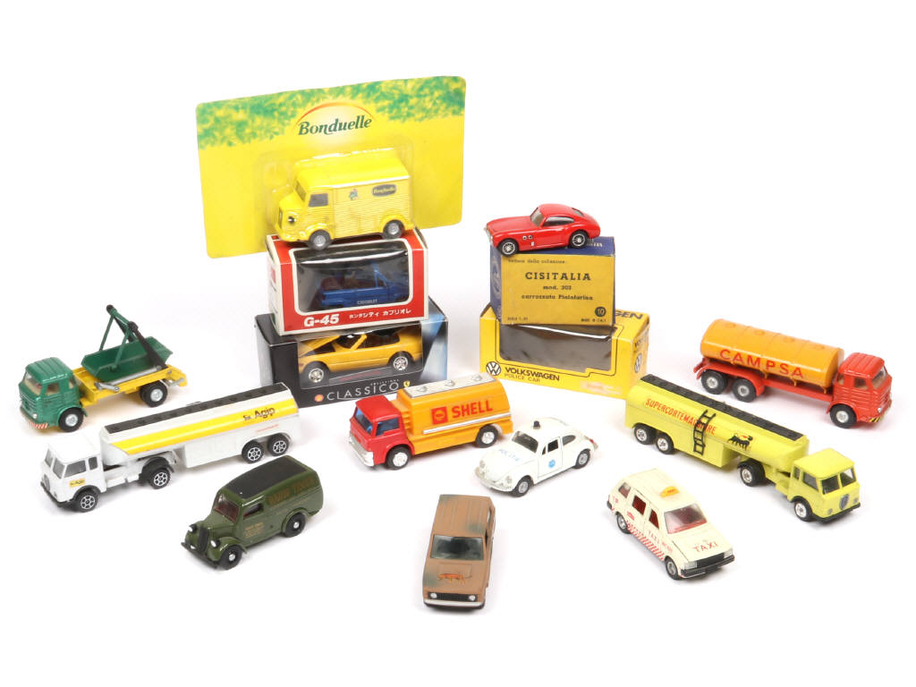 différentes compositions - comprend notamment les modèles : PEGASO, VOLKSWAGEN, CISITALIA, CITROEN & RANGE ROVER - on y retrouve notamment les marques : YONEZAWA TOYS DIAPET, TOMICA DANDY, JOAL, PILEN, DINKY MATCHBOX, DUGU (manque moteur - plancher dériveté), PENNY & POLISTIL - 5 modèles en boites (états 'b' à 'c')