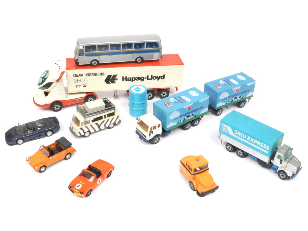 comprend notamment les modèles : COLANI 'HAPAG-LLOYD' (avec 4 fûts 'ARAL' - une pression du pare-chocs avant fait lever la cabine), PORSCHE, JAGUAR, VOLKSWAGEN & SETRA - on y retrouve les marques : GAMA, MINICHAMPS, MÄRKLIN, CURSOR MODELL & SIKU