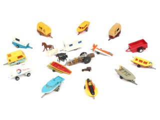 MAJORETTE (FRANCE) Ensemble de différentes remorques, embarcations, un planeur & des animaux