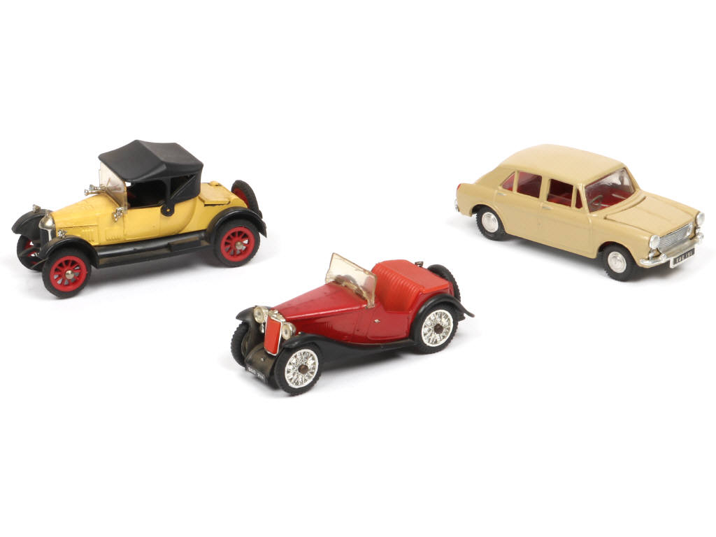 carrosseries légèrement encrassées - comprend : MORRIS 1100, M.G MIDGET (manque capote) & BULL NOSE - avec détails ajoutés - pneus séchés