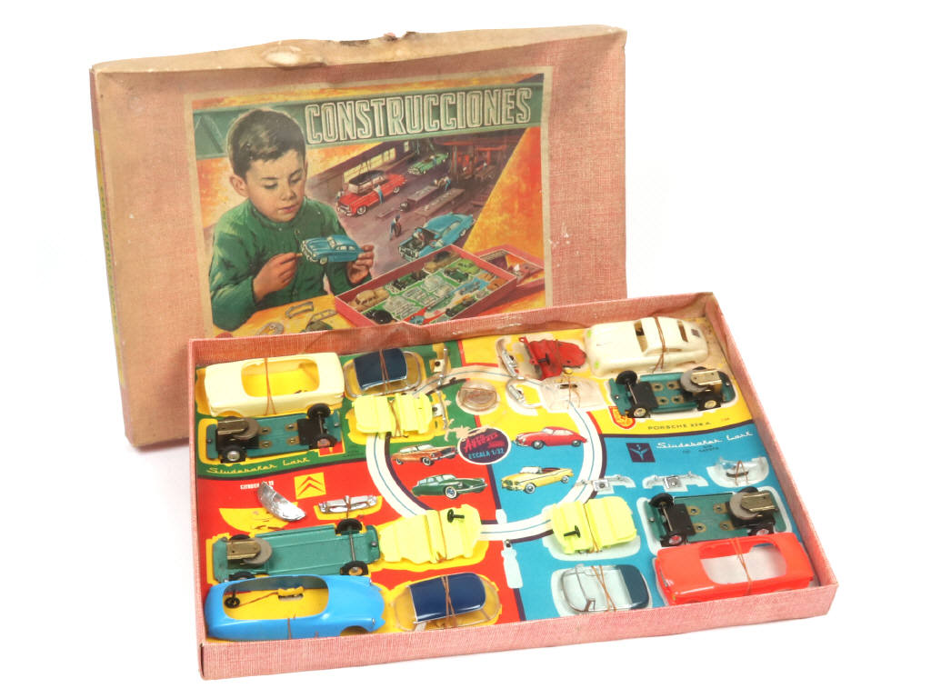 échelle 1/32ème - dimensions du coffret : 51,5 x 35 cm - contient carrosseries : STUDEBAKER LARK (2 exemplaires dont un coupé & un cabriolet), CITROEN DS 19, PORSCHE 356 A, 4 châssis avec moteurs à friction (non testés), 4 aménagements intérieurs (dont un avec parties ternies), vitrages, pare-chocs, boîte de visseries & tournevis (non visible sur la photo) - ensemble maintenu d'origine sur carton de présentation illustré (avec vis dont certaines oxydées & élastiques de maintien jaunis, séchés & incomplets) avec dénomination de chaque véhicule & sa référence - ensemble plus ou moins encrassé - coffret plus ou moins taché (certaines majeures), décoloré & déformé - pellicule chromée légèrement altérée par endroits