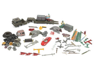 comprend : carrosseries pour véhicules démontables, camion BERLIET militaires transport de chars, FIAT ABARTH, tracteurs (moteurs à clef fonctionnels), banquettes, attelages, pneus, roues, socs & clefs - on y retrouve notamment les marques : SOLIDO (en très grande majorité) & BRITAINS - avec manques & parties cassées - quelques éléments avec métal fatigue