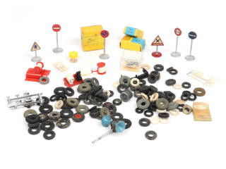 comprend notamment : roues en zamac, pneus DUNLOP, pneus références 12 & 090 (dont 2 boites incomplètes) - possibilité d'exemplaires séchés - on y retrouve principalement la marque DINKY TOYS