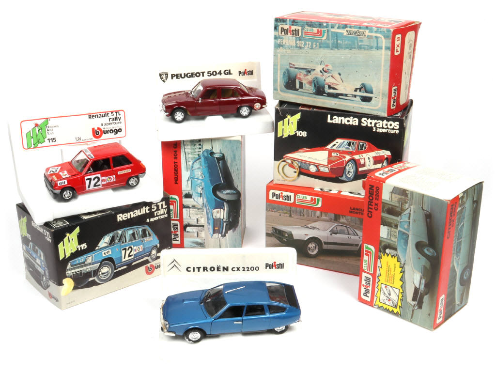 échelle 1/24ème - comprend les modèles : CITROEN (un élément recollé), PEUGEOT, RENAULT (quelques petits éclats), LANCIA & FERRARI - boites en états 'b' & 'c' - on y retrouve les marques : BBURAGO & POLISTIL