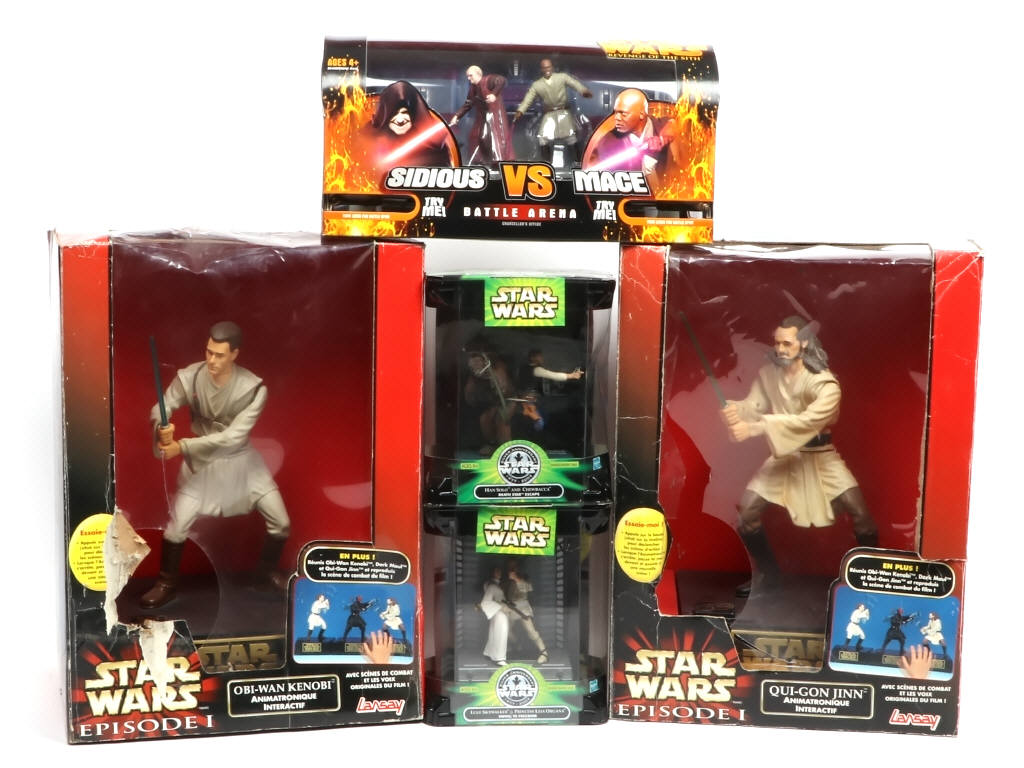 comprend : OBI-WAN KENOBY & QUI-GON JINN (animatronique, blisters déchirés), SIDIOUS VS MACE, HAN SOLO AND CHEWBACCA & LUKE SKYWALKER AND PRINCESS LEIA ORGANA - on y retrouve les marques LANSAY & HASBRO - boites avec accrocs, frottements & déchirures (3 scellées)