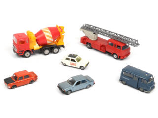 comprend notamment les modèles : MERCEDES (intérieur de toupie avec traces de peinture), BERLIET, SIMCA, PEUGEOT & RENAULT - avec petits manques & parties cassées