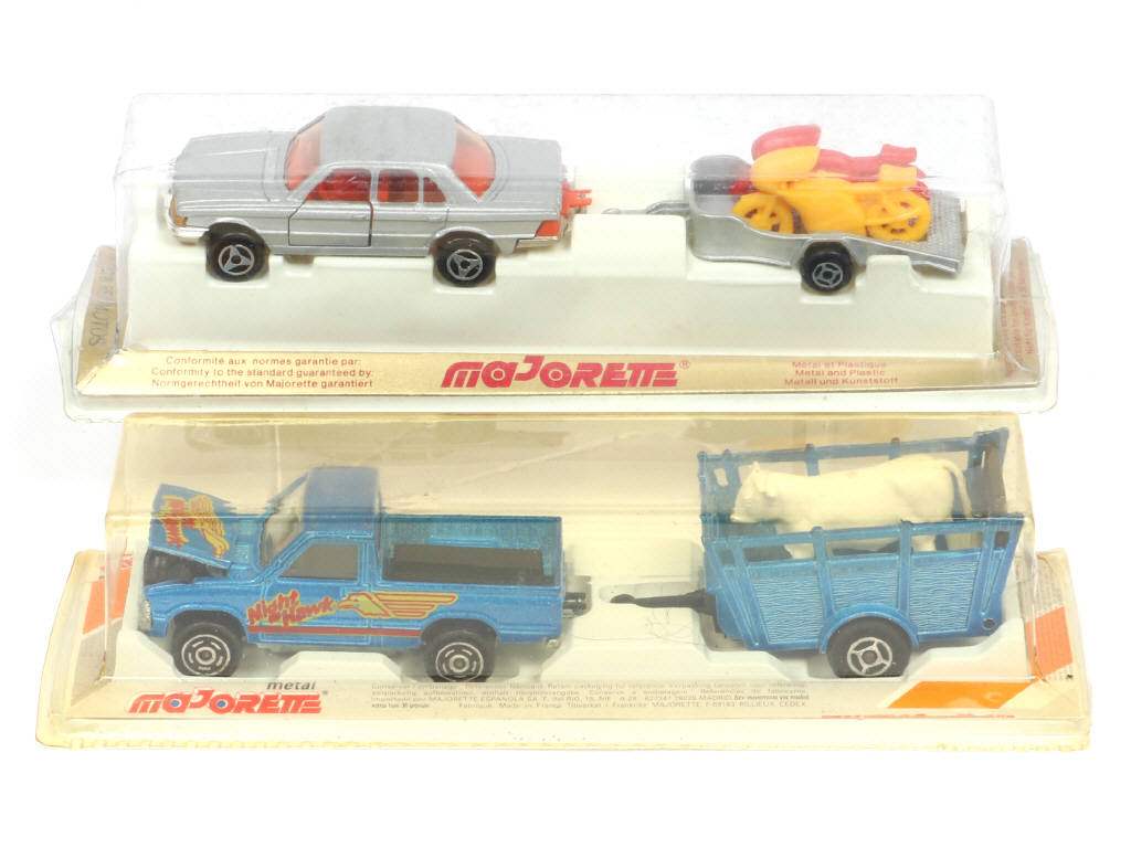 MAJORETTE (FRANCE) Ensemble de 2 voitures, 2 motos, un animal & 2 remorques