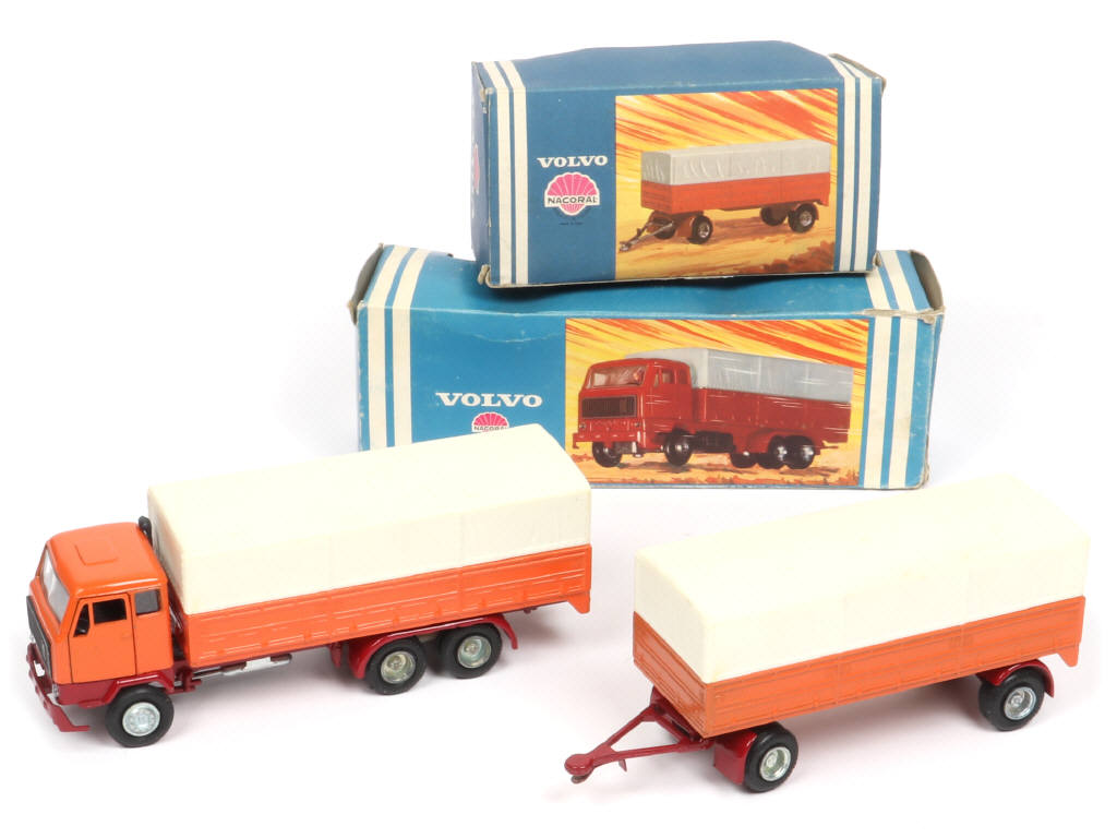NACORAL (ESPAGNE) 201-202 VOLVO Plateau à ridelles bâché avec remorque bâchée orange, grenat & blanc