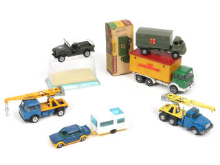 comprend notamment les modèles : FIAT, ESADELTA & JEEP - on y retrouve les marques : PENNY, MERCURY, MEBETOYS & POLITOYS - 2 modèles en boite état 'c' - on y joint un camion-grue de la marque GUISVAL (état 'c')