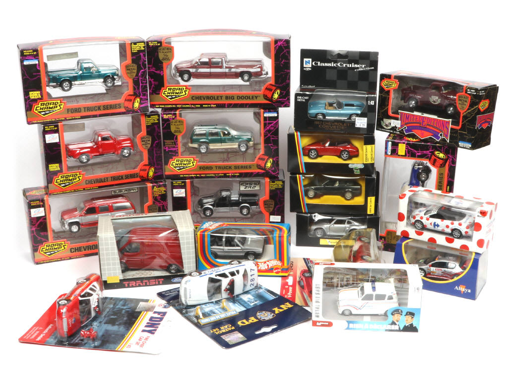comprend notamment les marques : HOT WHEELS, NOREV, ROAD CHAMPS & NEWRAY - on y retrouve notamment les modèles : REANUL 4 L "RIEN A DECLARER", PEUGEOT 206 WRC, FORD TRUCK SERIES & CHEVROLET TRUCK SERIE - boîtes en états 'a' à 'c'