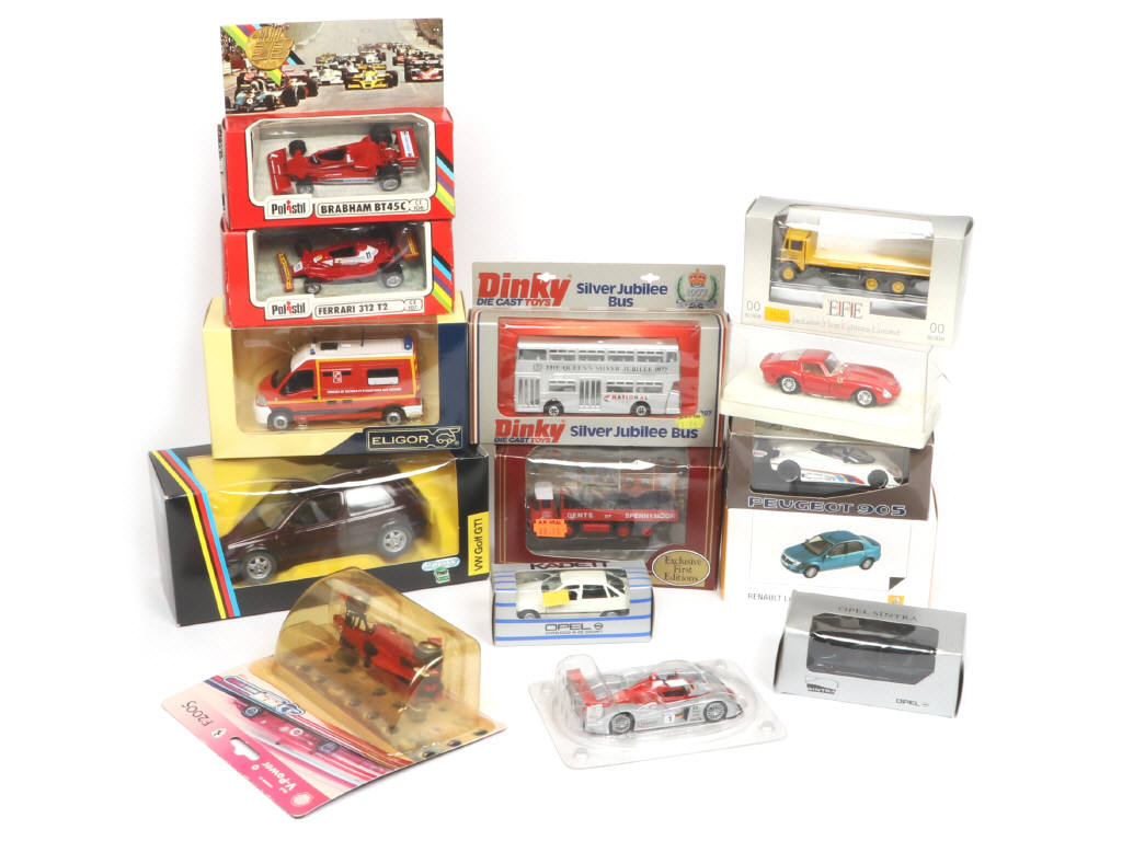 différentes échelles - comprend notamment les marques : POLISTIL, ELIGOR, DINKY & VITESSE - on y retrouve notamment les modèles : BRABHAM BT45C, RENAULT MASTER VSAV SAPEURS-POMPIERS & RENAULT LOGAN - boîtes en états ''b' à 'c'