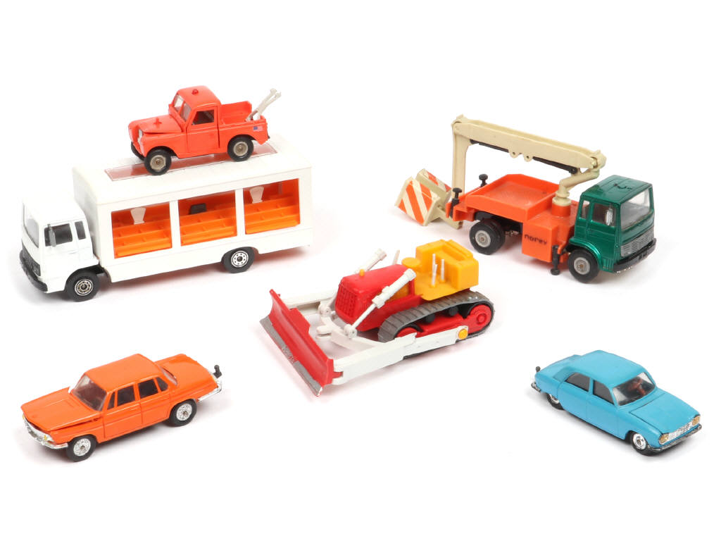 comprend les modèles : SAVIEM, CONTINENTAL & LAND ROVER - avec manques & parties cassées - on y joint 2 voitures (BMW & PEUGEOT) de la marque MINIALUXE avec déformations & petits détails ajoutés