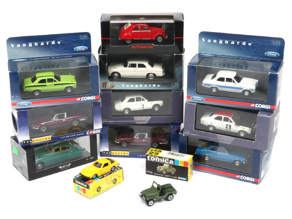miniatures reproduisant notamment les modèles : FORD, TRIUMPH & BENTLEY - on y retrouve les marques : CORGI TOYS, NEO, TOMICA & VANGUARD - les boîtes sont en états 'a' & 'b'