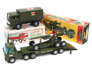 réalisation en tôle & plastique - longueur du plus grand : 37 cm - comprend : MERCEDES camion bâché ambulance & camion semi-remorque porte-canon (canon non testé - une fixation de support cassée à recoller) - boites en états 'a' & 'c'