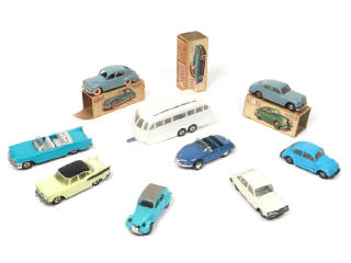 comprend notamment les modèles : LANCIA, PEUGEOT, CITROEN, RENAULT, SIMCA & VOLKSWAGEN - avec manques, parties cassées & déformées - 2 modèles en boite (état 'd') - on y joint une boite vide de SIMCA PLEIN CIEL en état 'd' - on y joint une voiture TURBO I d'après FRANQUIN de la marque IDEM