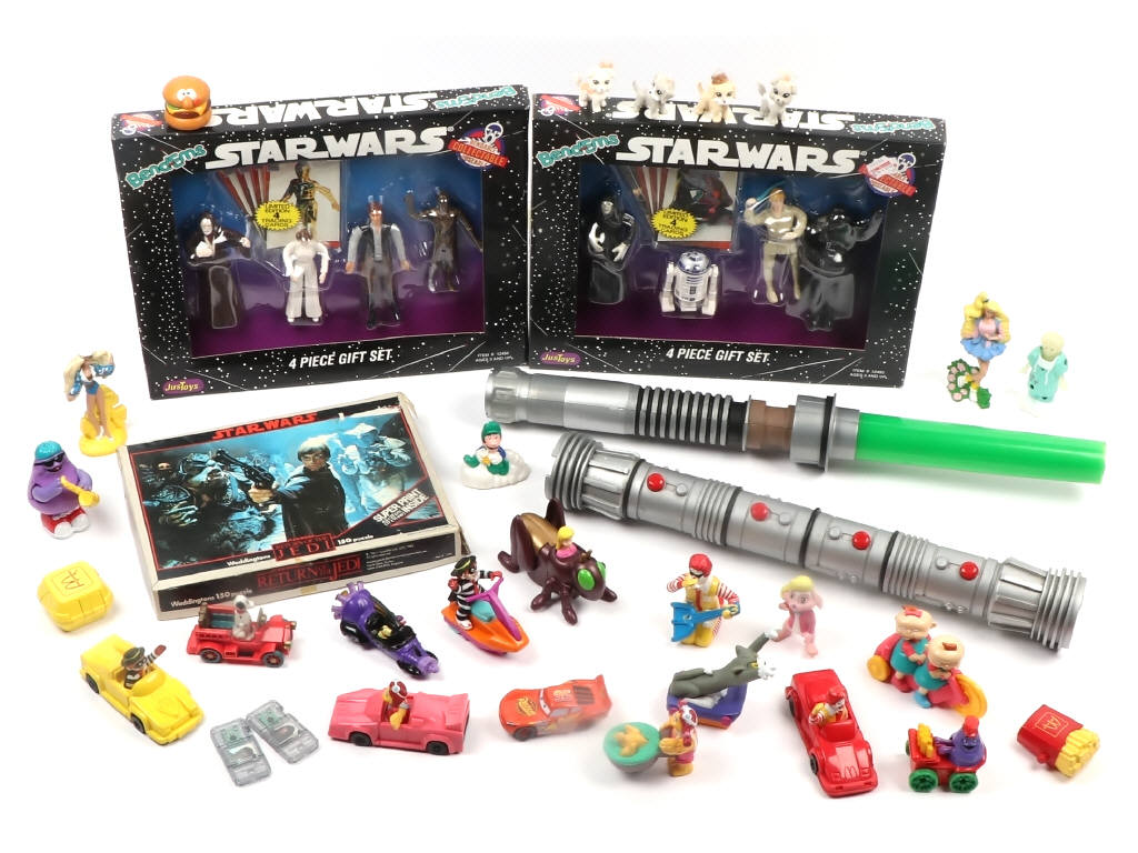comprend : 2 sets de figurines STAR WARS en PVC, un puzzle LE RETOUR DU JEDI (incomplet - boite déchirée), 2 sabres laser (non testés) & 26 figurines de FAST FOOD - boites en état 'b' avec accrocs & frottements - on y retrouve les marques MAC DONALDS, BENDEMS & WADDIGTONS GAMES - avec manques & parties cassées