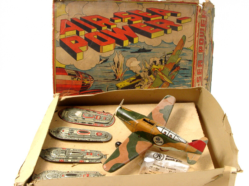 dimensions du coffret : 38,5 x 31 x 11 cm - contient un bombardier léger & 4 bateaux en tôle lithographiée - avec 4 bombes - les 4 bateaux sont montés sur des lamelles souples qui se déclenchent lors de l'impact de bombe & font sauter les navires