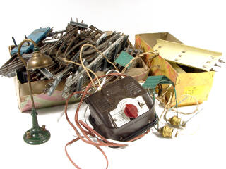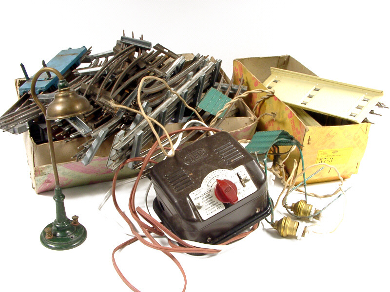 états de 'C' à 'F' - comprend : un passage à niveau électrique (avec boîte), un pont métallique (avec boîte), un transformateur de type 6049U, 18 rails & 2 boîtes d'éclairages électriques pour wagons - on y joint un wagon à ranchers de marque LR, un transformateur 110/220 volts de marque SITAR, un lampadaire électrique & 2 auvents avec éclairage artisanal de marque inconnue