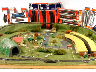 comprend : une locomotive à vapeur type 030, 4 motrices, 7 voitures de voyageurs, 4 wagons, 13 boîtes de rails, 5 boîtes d'éléments de décor & 2 transformateurs - on y joint un transformateur de marque JOUEF & un autre de marque ROCCO