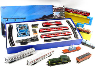 comprend : une motrice diesel BB-63001, 3 voitures de voyageurs, un wagon-citerne BUTAGAZ, un wagon surbaissé porte-transformateur, un wagon-plateau avec chargement de caisses & un wagon-tombereau avec chargement de charbon - manque un butoir sur un modèle - 3 modèles sans boîte