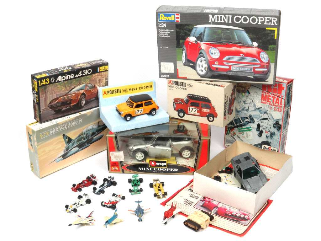 dont certains à monter - différentes échelles (la plus grande : 1/18ème) - comprend notamment les marques : REVELL, HELLER, BBURAGO, POLISTIL & MATCHBOX - boites en état 'b' (certains modèles sans - petits manques sur certains)