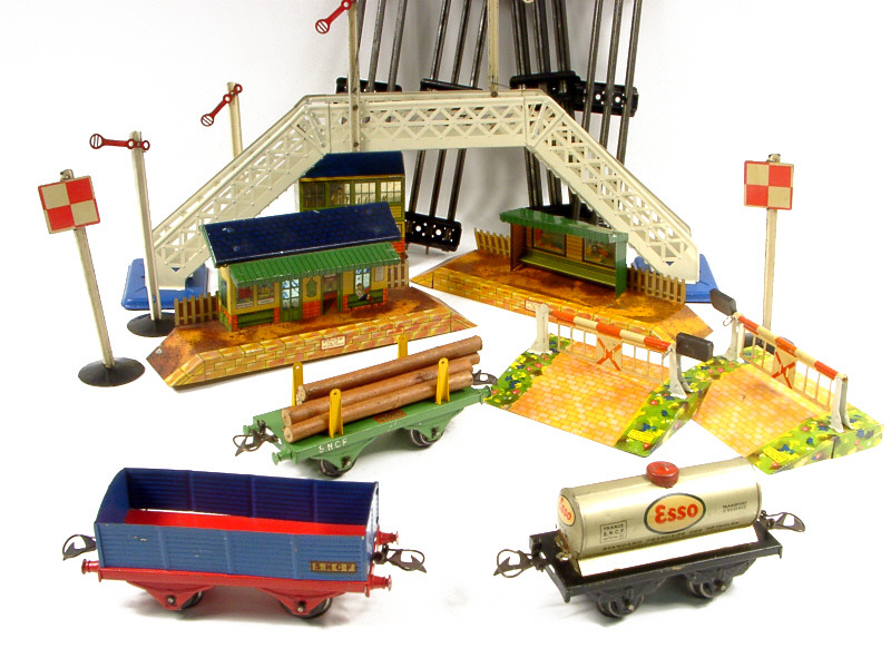 comprend : un wagon-citerne ESSO, un wagon-tombereau, un wagon-plateau à ranchers avec chargement de billes de bois (marquages non d'origine & manque chaînettes), une passerelle avec sémaphores, un passage à niveau, une petite gare en tôle lithographiée, un abri de quai en tôle lithographiée, un poste d'aiguillage en tôle lithographiée, 4 signaux de voie & 5 rails droits
