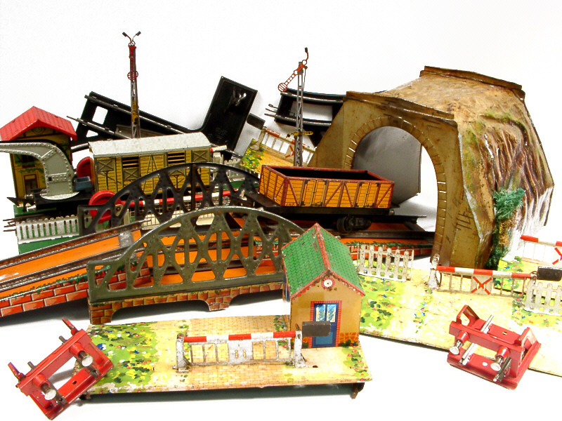 états de 'B' à 'E' - comprend : un wagon de dépannage, un wagon-tombereau, 3 passages à niveau, un pont, un tunnel, 2 heurtoirs, 2 signaux & 2 aiguillages - on y retrouve notamment les marques : JEP, HORNBY, MÄRKLIN & BING - quelques petits manques