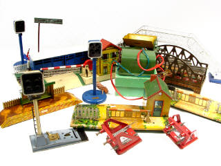 états de 'B' à 'E' - comprend : un wagon-fourgon à bestiaux, un wagon-benne basculante, 2 passages à niveau, un pont, un transformateur (avec boîte), une passerelle, 3 signaux, un abri de quai, 2 heurtoirs & un panneau - on y retrouve notamment les marques : JEP, HORNBY & BING