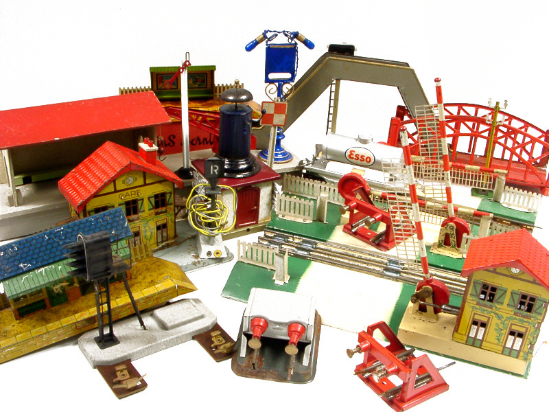 états de 'B' à 'E' - comprend : un wagon-citerne ESSO (avec boîte), 2 passages à niveau, un quai de chargement, 7 signaux, un pont, 2 petites gares, un abri de quai, un kiosque à journaux, un signal sonore, une passerelle & 3 heurtoirs - on y retrouve notamment les marques : JEP, HORNBY & MÄRKLIN - quelques petits manques