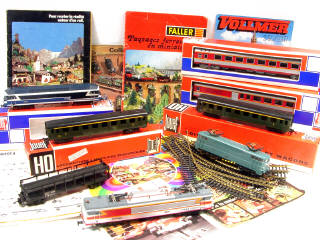 états de 'A' à 'D' - comprend : 3 motrices (2 modèles avec boîte), 5 voitures de voyageurs (3 modèles avec boîte), un wagon transport d'autos (manque chargement), 9 rails courbes, un contacteur à piles & 2 catalogues - on y joint 8 catalogues des marques : KIBRI, FALLER, VOLLMER, WIKING, LUNDBY & POLISTIL