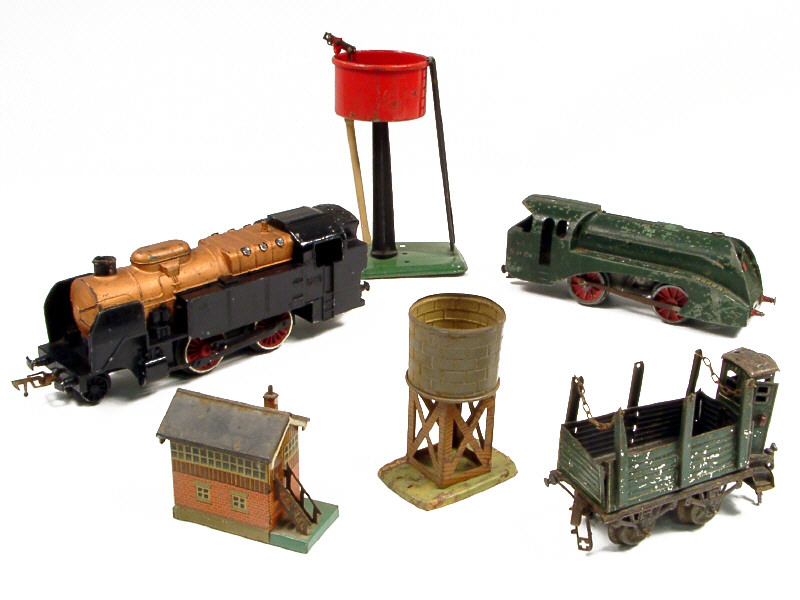 états de 'D' à 'F' - comprend : un wagon-tombereau avec ranchers, 2 châteaux d'eau & un poste d'aiguillage - on y retrouve notamment les marques BING & HORNBY