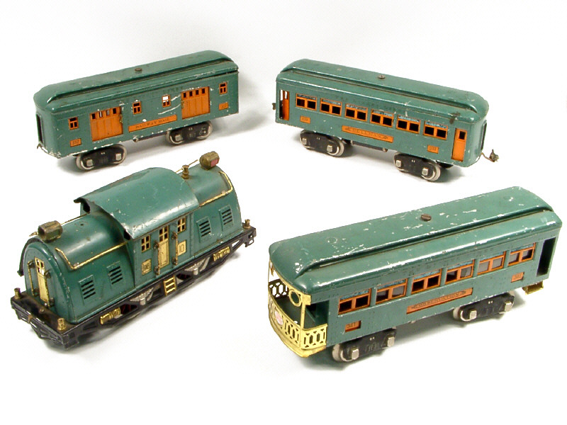 écartement 52 mm - comprend : une motrice électrique, une voiture PULLMAN, une voiture de queue & un fourgon postal - avec manques