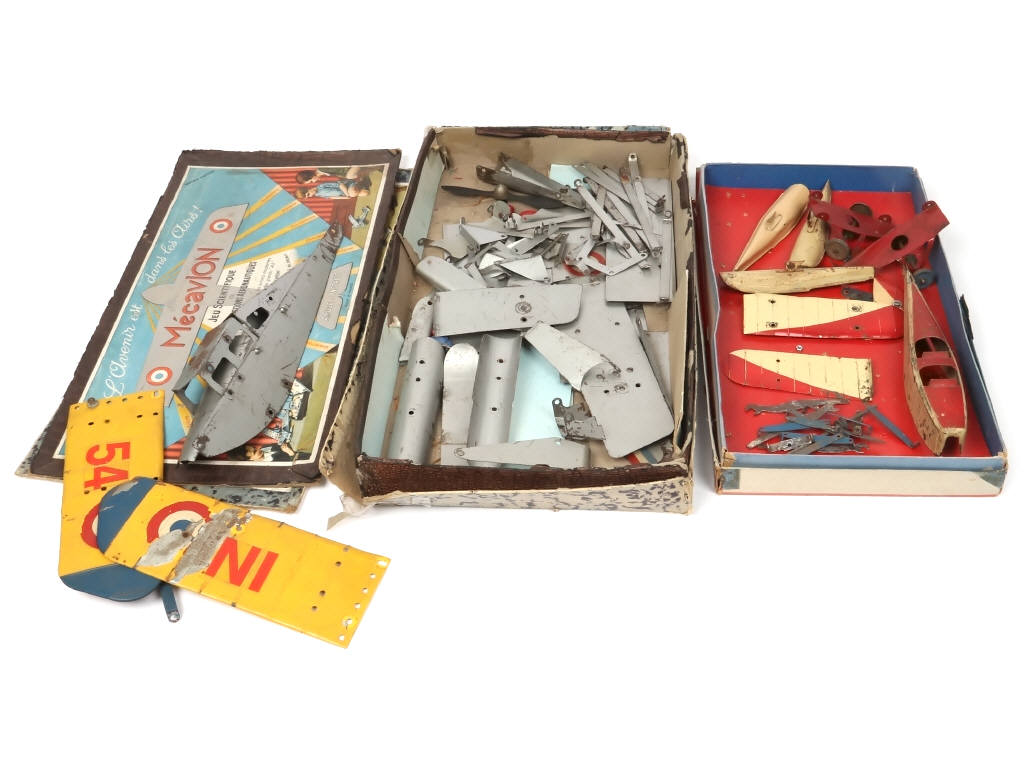 comprend notamment : fuselages, ailes, supports, poulies, pilote, roues & hélices - possibilité de manques & parties cassées - oxydation - on y retrouve les marques : MECAVION & MECCANO