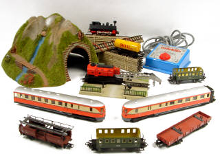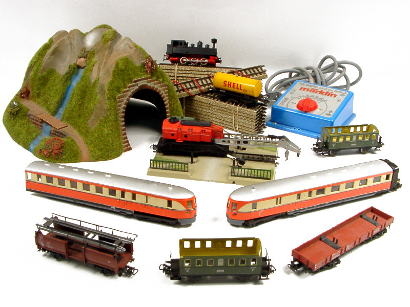 comprend : un autorail à 2 éléments, une locomotive à vapeur de type 030, un wagon-citerne SHELL, un wagon-transport d'autos, 2 voitures de voyageurs de 2ème classe (manque les toits), un wagon-plateau à ridelles basses, un wagon-grue, un tunnel, un passage à niveau, un transformateur & un ensemble de rails - on y retrouve notamment les marques MÄRKLIN & FLEISCHMANN - quelques petits manques