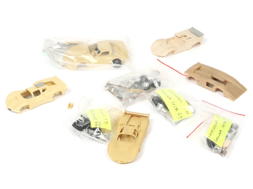 réalisation en métal & résine - à monter (semblent complets) - comprend principalement le modèle CHAPARRAL - on y retrouve notamment les marques : MARSH MODELS, ESDO & PROVENCE MOULAGE - un petit élément cassé à recoller