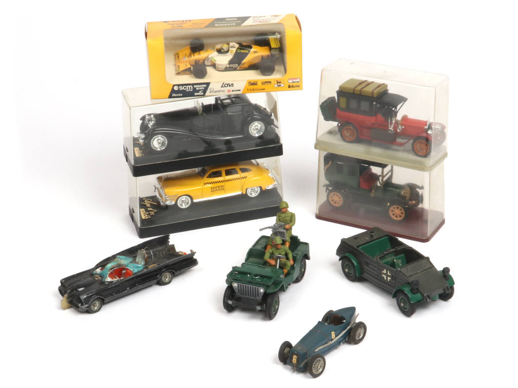 comprend notamment les modèles : BATMOBILE, CHRYSLER, DELAGE, BUGATTI & JEEP - on y retrouve les marques : ONYX, CORGI TOYS, SOLIDO, J.M.K & BRITAINS - avec manques & parties cassées