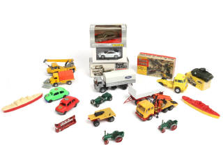 on y retrouve notamment les marques : SOLIDO, MATCHBOX, VEREM, NZG & POLITOYS - avec manques & parties cassées - 5 modèles en boites en état 'b' à 'd'